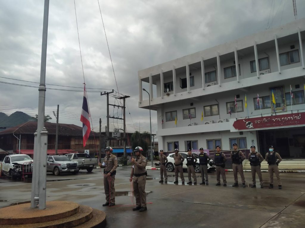 พ.ต.ท.จักรราช หงษา สวป.สภ.ท่าลี่ เรียกแถวข้าราชการตำรวจ ร้อยเวร 2-0 ชุดสายตรวจรถยนต์ ผลัดเก่า ผลัดใหม่ และสายตรวจจราจร เครพธงชาติ ไหว้พระ สวดมนต์ กล่าวอุดมคติ กล่าวคำสัตย์ปฏิญาณ