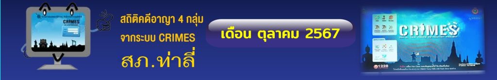 - ข้อมูลผลการดำเนินงานในเชิงสถิติด้านคดีอาญา 4 กลุ่มตามระบบ CRIMES เดือน ต.ค.67 ในรูปแบบไฟล์ PDF คลิ๊กดูที่นี่