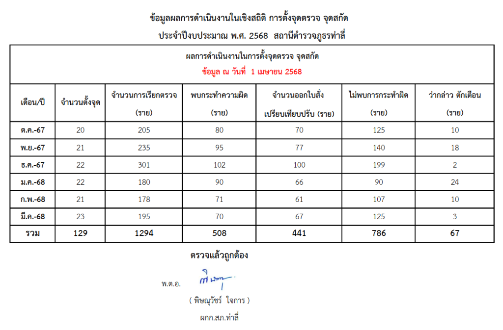 สถิติการตั้งจุดตรวจ จุดสกัด 6 เดือนแรก(ต.ค.67-มี.ค.68)