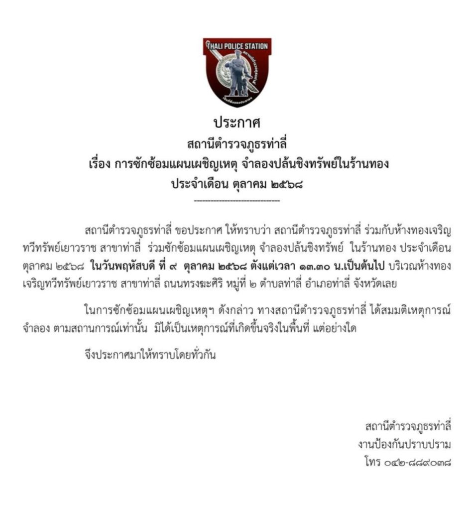 ประกาศ เรื่อง การซักซ้อมแผนเผชิญเหตุ จำลองปล้นชิงทรัพย์ในร้านทอง